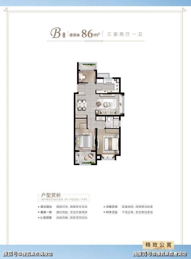 【同润新云都会】售楼处预约咨询热线:400-8877-480建面约86㎡3房2厅1卫户型特点:做到了双开间朝南+双阳台设计+卫生间干湿分离,一个非常紧凑的小3房户型。