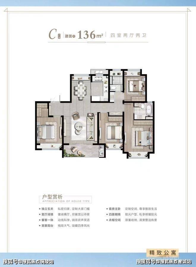 【同润新云都会】售楼处预约咨询热线:400-8877-480建面约136㎡4房2厅2卫户型特点:做到了四开间朝南+全卧飘窗+主卧套房设计+南北通透+客卫干湿分离,一步到位的改善型大4房。