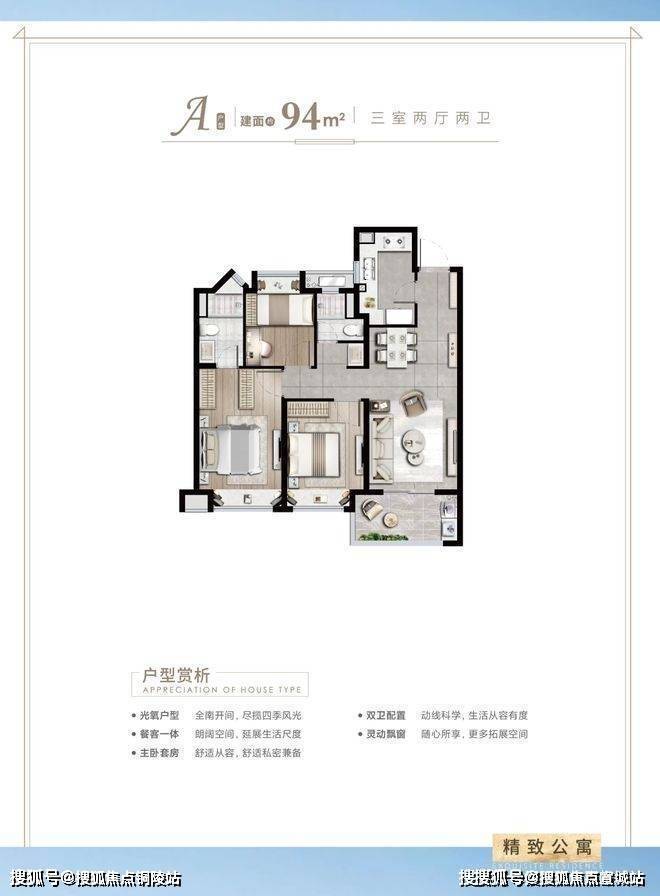 【同润新云都会】售楼处预约咨询热线:400-8877-480建面约94㎡3房2厅2卫户型特点:做到了三开间朝南+主卧套房设计+全卧飘窗+动静分离+卫生间干湿分离,功能性与空间感完美结合的3房“神户型”。