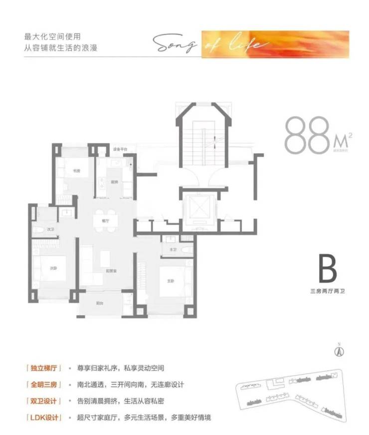 相较于市面上普遍的建面约88㎡只能做3房1卫的设计,该户型竟做到惊人的3房2卫!