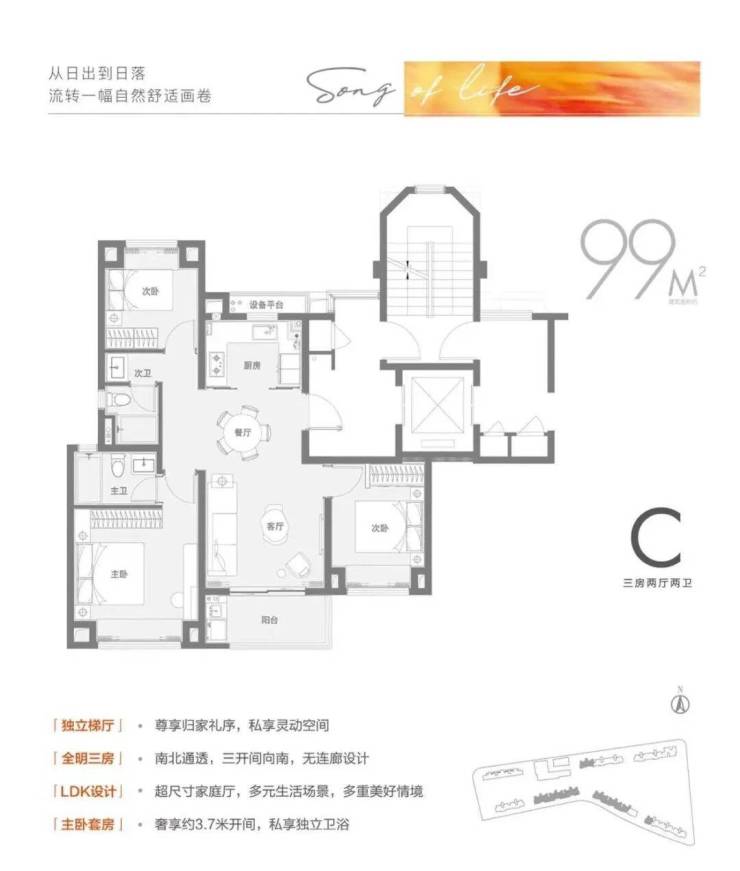 建面约99㎡3房2卫户型不仅保留三开间朝南和餐客厅一体化的优势,更在尺度上大踏步进阶。