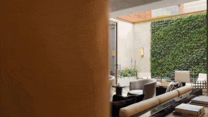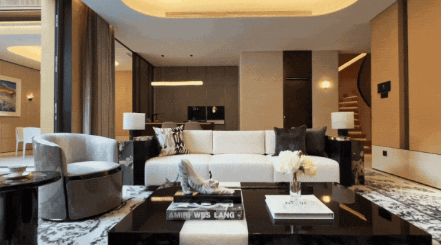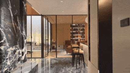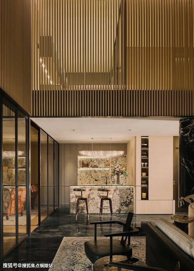 透过瀑布湍流的天光庭院,你在泳池里就可以看到会客厅中家人相伴的身影。会客厅沙发背后的镂空转角奢石景墙与金属屏风,不只是装饰品,它让会客厅与背后奢华的大堂吧隔而不离。你可以透过它,看到吧台的透光奢石景墙。