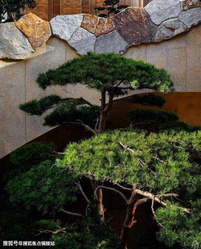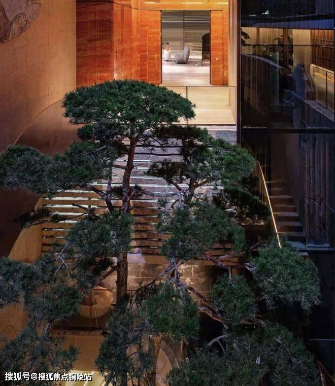 顺着旋梯而下,地下一层高约8米的双杆孪生连理松,与墙面上的原生山石皮,在你身旁环绕成了层峦叠嶂的意象。