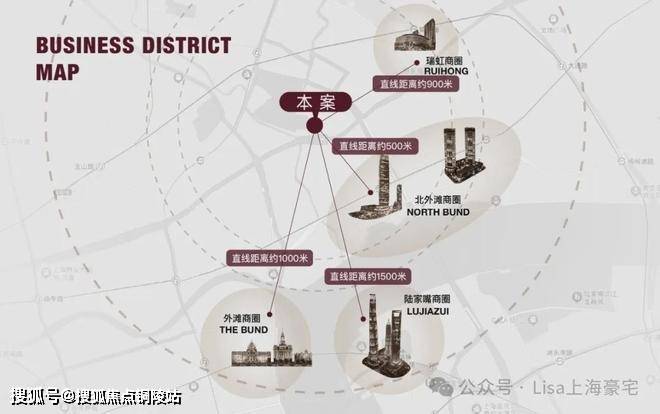 北外滩商圈直线距离约500米;外滩商圈直线距离约1000米;陆家嘴商圈直线距离约1500米;瑞虹商圈直线距离约900米。