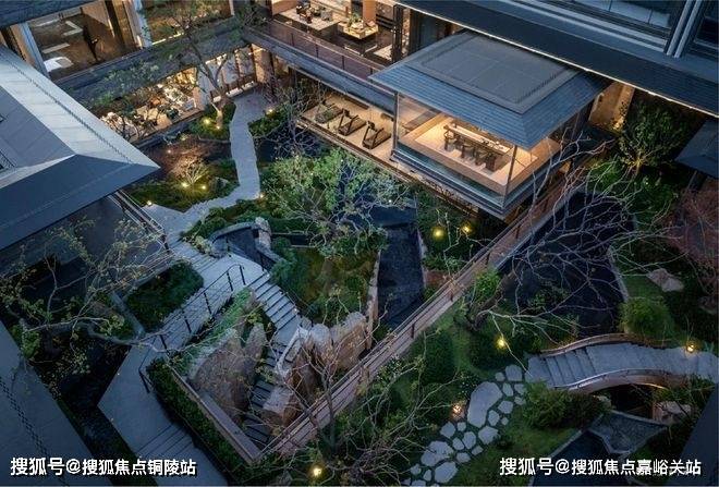 而最令人惊艳的,当属约6米地势差打造的下沉式山水庭院,山、石、水、林有序交织,犹如一幅“豁然开朗”山水轴卷,每一步皆是景致,每一处皆有不同。