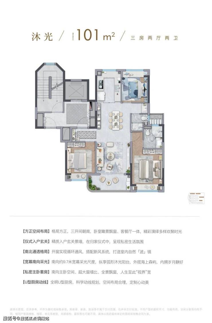 所以,虽然户型的建筑面积是约101㎡的3房,但整个空间的尺度感却能匹配改善型的宽绰3房。