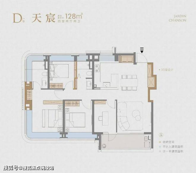 项目建面约128㎡4房户型延续了前作3S墙的设计,保证了收纳空间的丰富性。