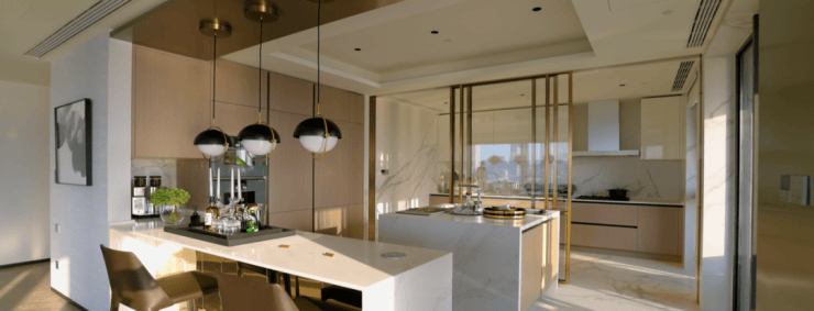 石英石台面、嘉格纳(或同档次)灶具、吸油烟机、洗碗机、冰箱、蒸汽烤箱的厨房六件套;239-251㎡户型并配有酒柜。