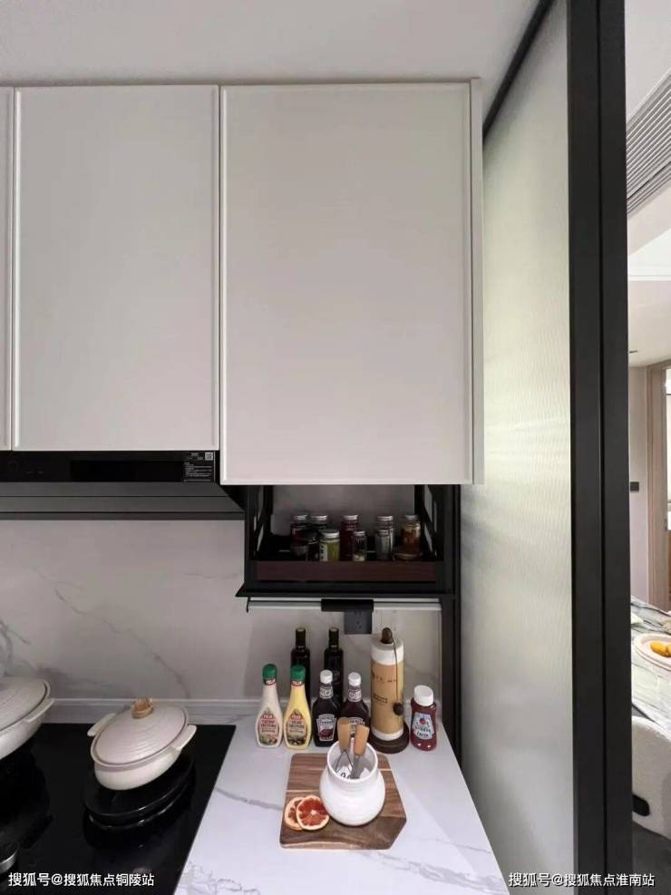 灶台旁更设计了一个下拉式的调味拉篮,轻松拿放的同时,也避免油渍沾在瓶瓶罐罐上。