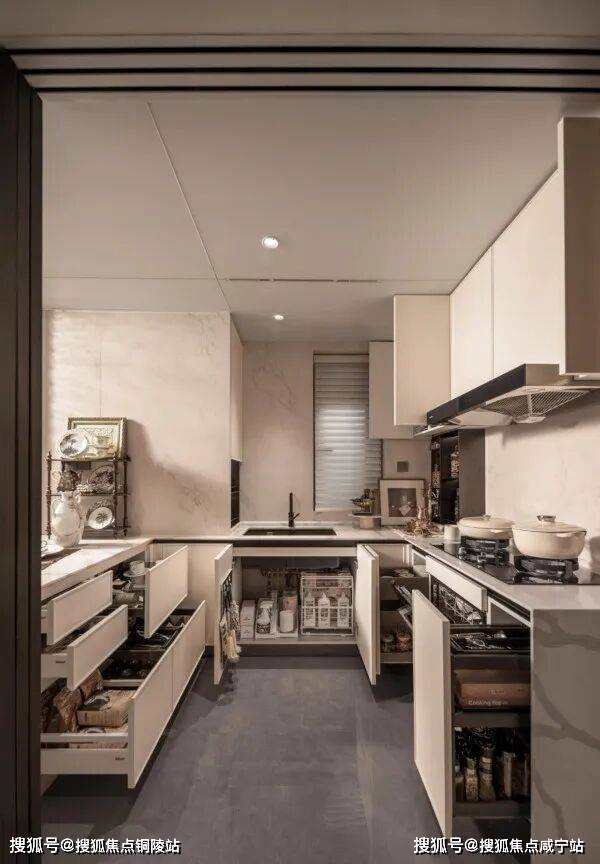 厨房更是堪称美食达人的天堂,集成一系列多功能调味拉篮、定制谷物抽屉等,收纳有序,油盐酱醋间的分类放置烦恼一次性得到解决,琐碎繁杂不再。
