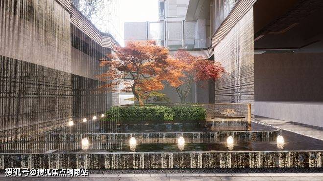 下沉庭院整体长约18米,进深约9.5米,庭院的上下景观通过水帘相连通,中间结合有着层层叠水的水景,搭配水晶砖的景墙,将品质感拉满。