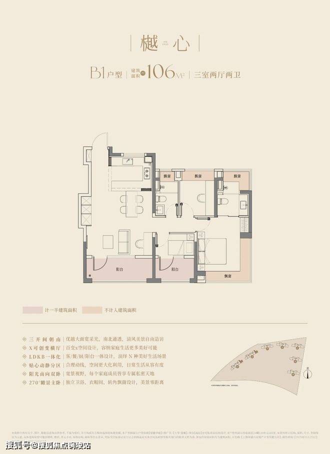 建面约106㎡的三房两厅两卫,3.5开间朝南,南向面宽达到约11.8m!碾压市面上以前的三开间朝南、10米面宽的三房户型。