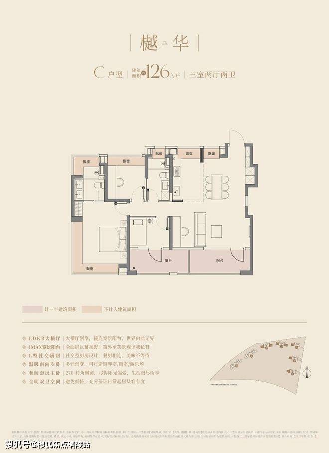 建面约126㎡三房两厅两卫,南向的总体面宽达到惊人的约13.2m,可以媲美市面上很多150㎡起步的豪宅产品的面宽了。