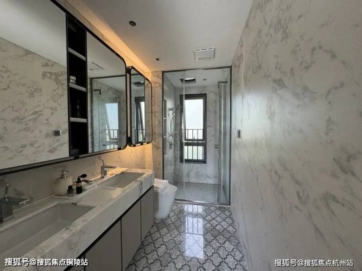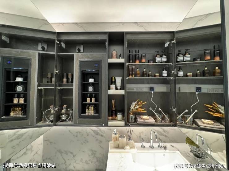 双卫配置,其中一个做了干湿分离,科勒台盆+双智能马桶+高仪花洒,除雾镜柜均内置了牙刷消毒器、预留吹风机插座。主卫镜柜还有美妆冰箱,收纳空间相当充足。