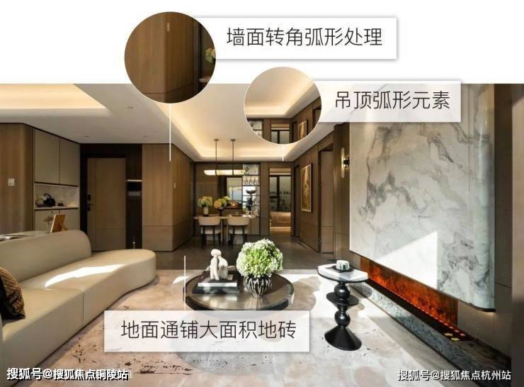 地面通铺的大面积地砖,在弧线元素呼应下,延伸出很强的开阔感。