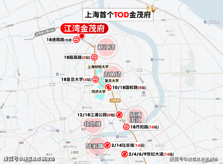 从通南路站(在建)出发,1站就是新江湾,3站财大,4站复旦,5站五角场,7站新华医院,10站杨浦滨江,11站陆家嘴滨江...