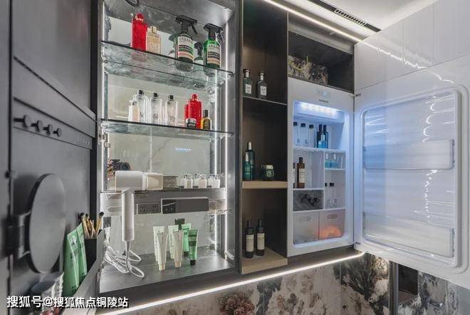 值得一提,保利戳中女性需求,主卫新增科勒美妆龙头,水流角度贴合化妆、护肤需求;主卫镜柜嵌入美妆冰箱,贴心存储口红、面膜等护肤品。