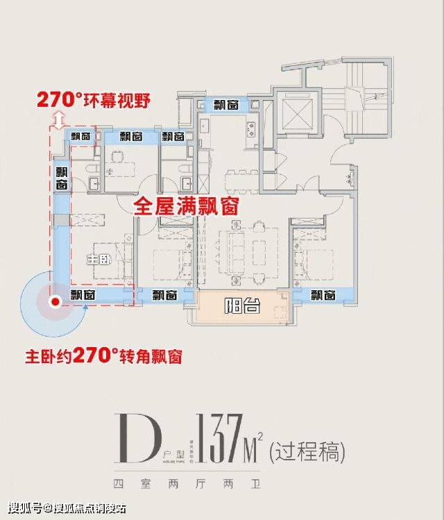 项目边套标配双270°飘窗,甚至主卫都设计了L型飘窗,形成“环幕景全景观舱”。