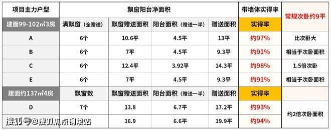 项目全系户型标配“全屋飘窗(全赠送)+大阳台(半赠送)”,经专业测算,百平米中间套实得率约91%,边套更甚,远超市场常规水平: