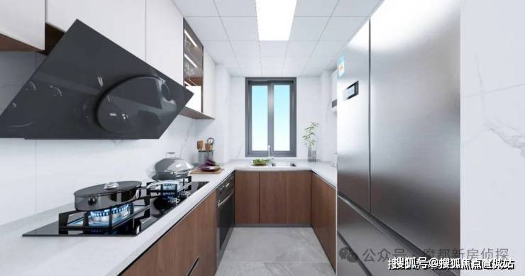 厨房为U型布局,配置定制橱柜、老板烟灶、林内热水器,台面为人造石,水槽为邦克台下盆,细节处体现人性化考量。