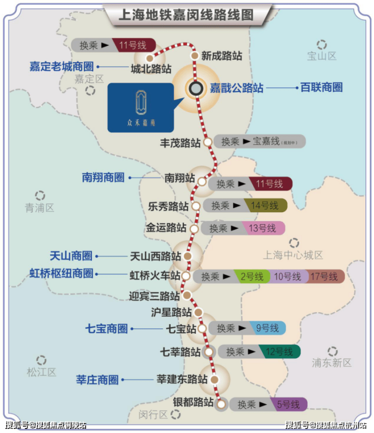 距众禾嘉苑仅一站的丰茂路站,即为一主二辅枢纽体系中的嘉定东枢纽,是嘉闵线、宝嘉线的换乘站,可为新城提供直达苏锡常的大容量、高可靠公共交通服务,是嘉定新城最具潜力的核心引擎。
