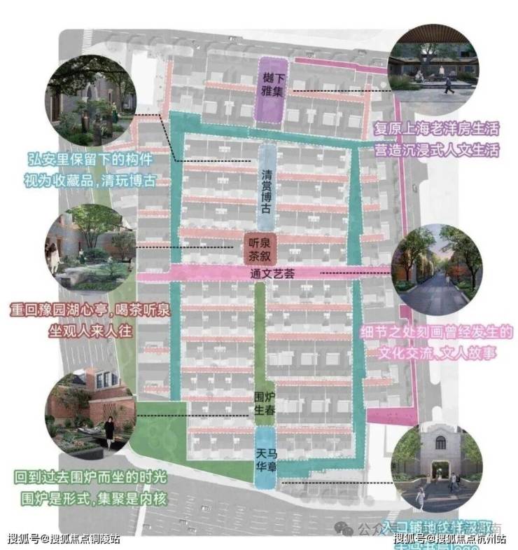 在社区的中轴上,弘安里植入记忆的符号与生活的画面,从入口处「天马华章」迈步前行,「围炉生春」「通文艺荟」「听泉茶叙」「清赏博古」贯穿到此次实景开放的「樾下雅集」,海派生活画卷昨日重现。