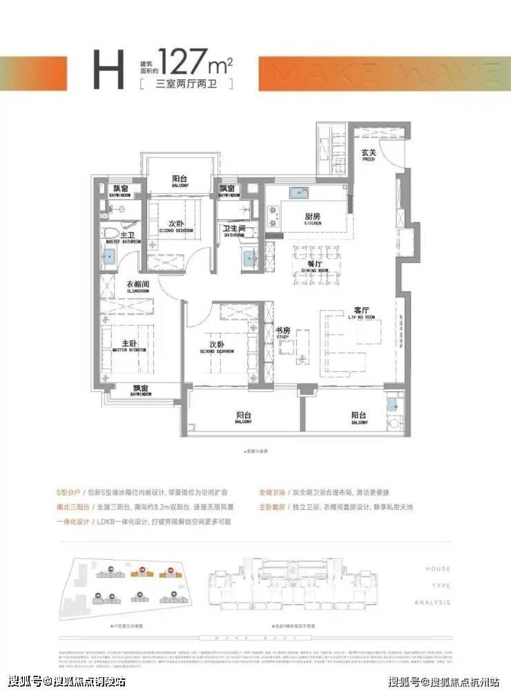建面约127㎡三房两厅两卫,该户型最大的亮点是有着比肩豪宅的南北三阳台黄金布局,这是2025年之后,松江首个三阳台户型。