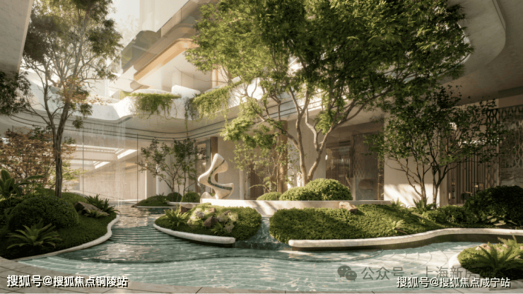 该项目规划的核心下沉庭院,以黄浦江为灵感,将江水流动的波纹形态、动态色彩与滩涂肌理转化为空间语言,通过水景、地形起伏与植物层次的组合,营造富有节奏感的花园场景。