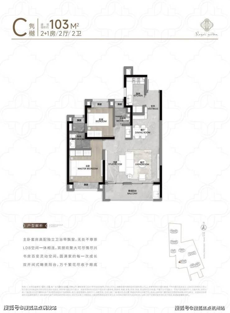 104㎡3户型特点:该户型多为楼栋的东边套,是一个观景户型。客厅连接270°阳台,视野出众。双卧朝南,阳光满溢。从次卫布局看,如果家庭人口较少,该户型还能做成双套卧。