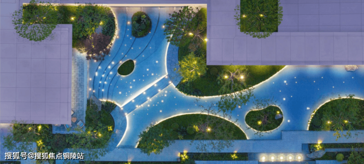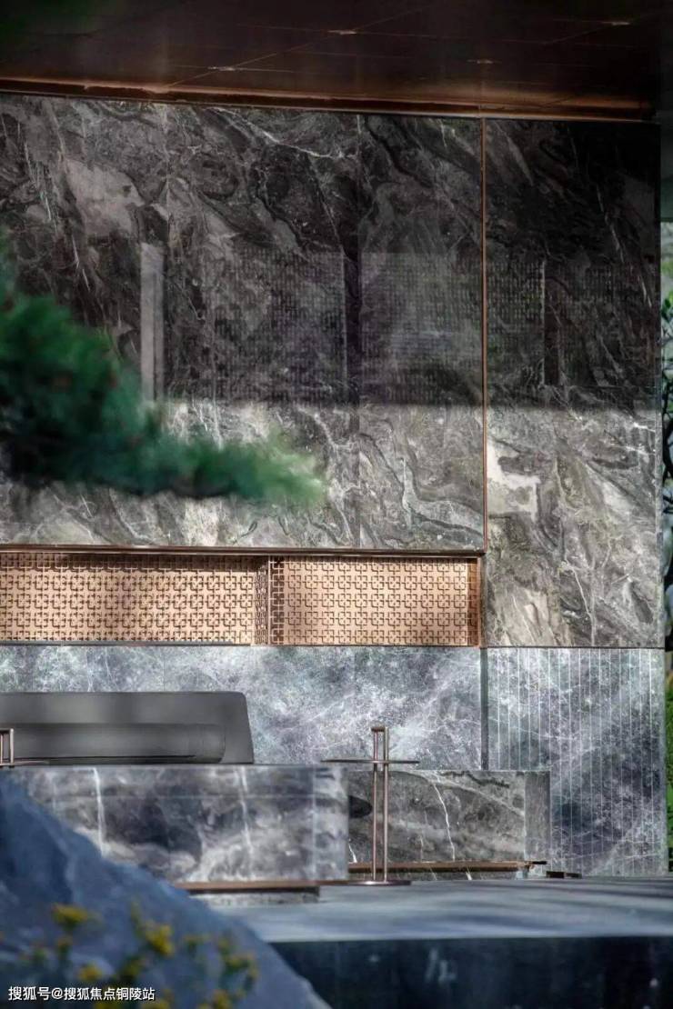 而大华星曜不仅打造了具有曲线美感的树池,还在水景底部铺了数百片蓝钻瓷片,全角度弧形定制,水刀切割,用金属线条勾勒出水波的形状。