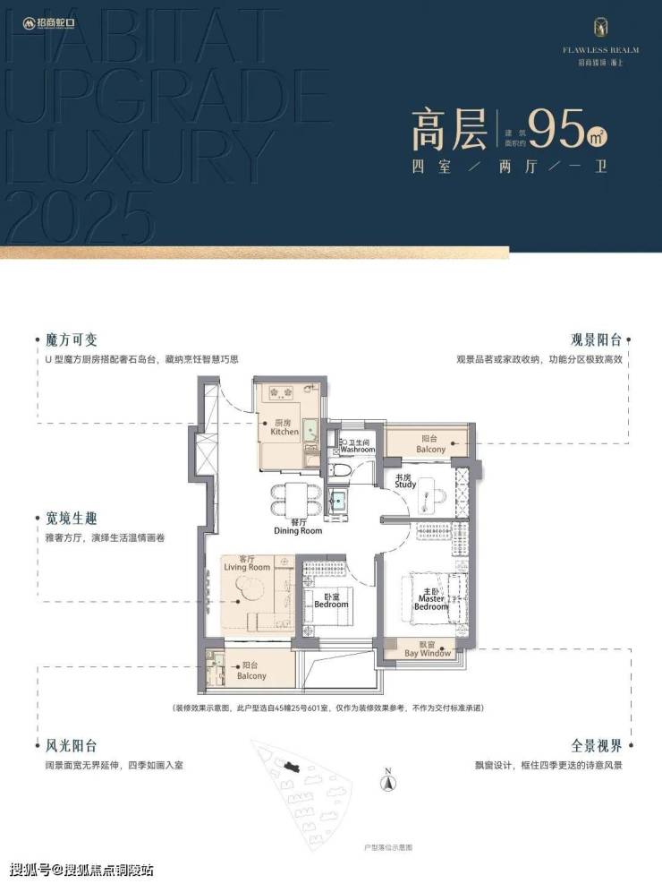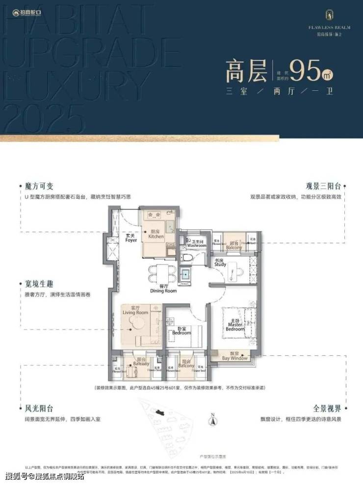 再加上南向大面宽短进深、全卧飘窗、L型转角阳台设计,哪怕小户型95㎡3房,尺度感都超棒,采光和视野更是一流。