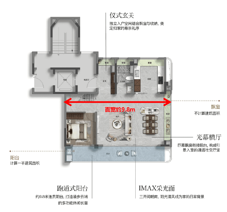 该户型最引人注目的特征是其约9.8米的南向三面宽,三个南向阳台贯通连接,形成罕见的“跑道式”超大阳台,将室内生活场景无限向外延伸。