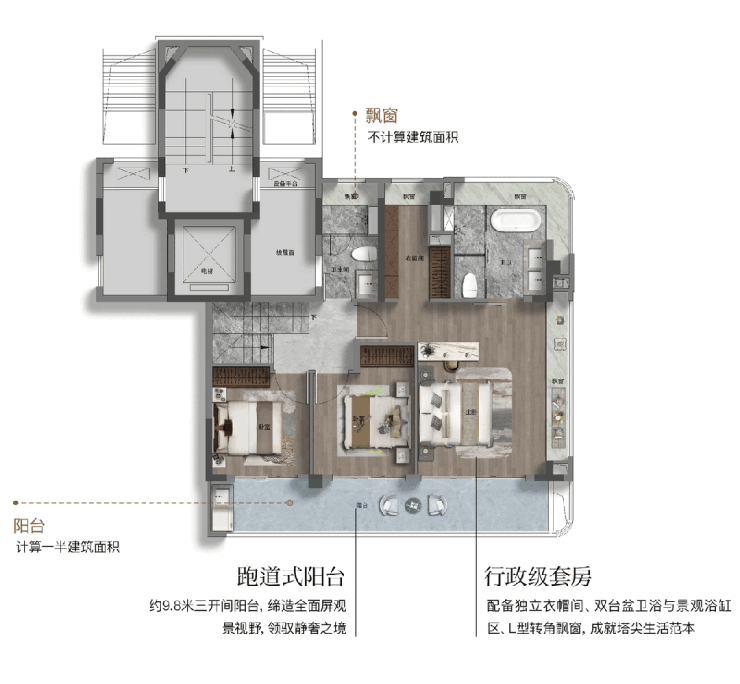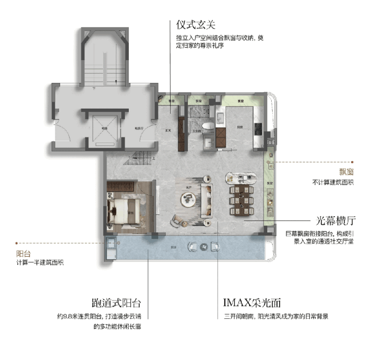 在细节打磨上,此户型亦不遗余力。全屋飘窗全赠送约9.8㎡,配合约7.2㎡的大阳台(计一半建筑面积)不仅增加了实际使用面积,更在视觉上提升了空间的通透感。