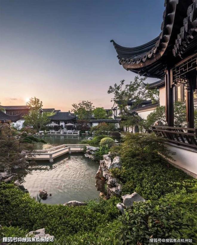园内设置七处景观组团,以中国各大古典名园为借鉴,并融入宋代的雅致生活韵味。宋式园林更强调“精而造疏,简而意足”,擅以意山水画为蓝本、以画设景,诗词为主题。步履其中,移步换景,步步生趣。花园组团规模扩大,户户有景,各自成趣,或临廊听雨,或观亭赏风,居住更为诗意。