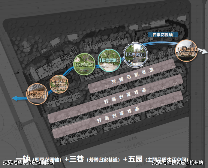 项目以「一轴-三巷-五园」为主题,打造约2.5万㎡尊享园林,营造“可漫步,可沉浸,可对话”的自然花园。