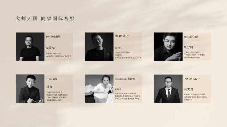 聚集享誉业界的团队——gad杰地设计、31.DESIGN、GVL怡境、德森建筑设计、NNS纳沃设计、Bluemoon布鲁盟,