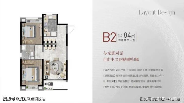建面约84㎡2房2厅1卫,做到了双开间朝南+双卧室带飘窗+动静分离,非常宽敞的2房户型。