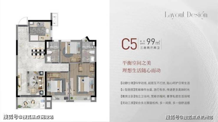 建面约99㎡3房2厅2卫,做到了三开间朝南+动静分离+南北通透+双卧室朝南+主卧套房设计+明厨明卫,室内通透明亮。