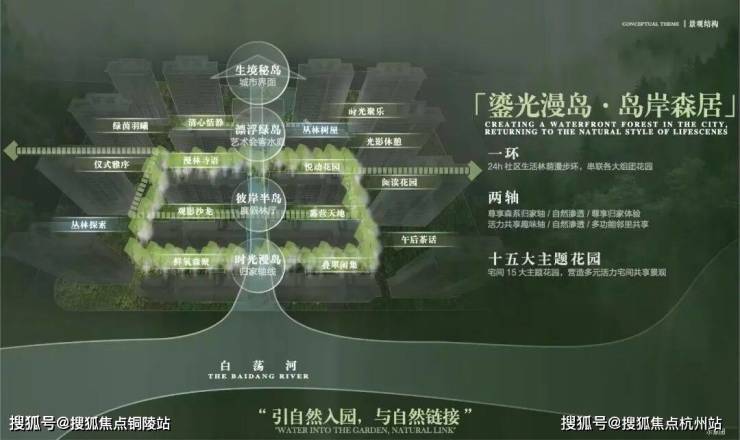 以“山水聚场”理念,规划“一环两轴十五园”景观布局,将水岸、岛屿、森林、花园、树屋作为园林节点,形成“行在景中、坐在岛中、游在林中、意在境中”的美学表达,营造出沉浸式山水活力场域。