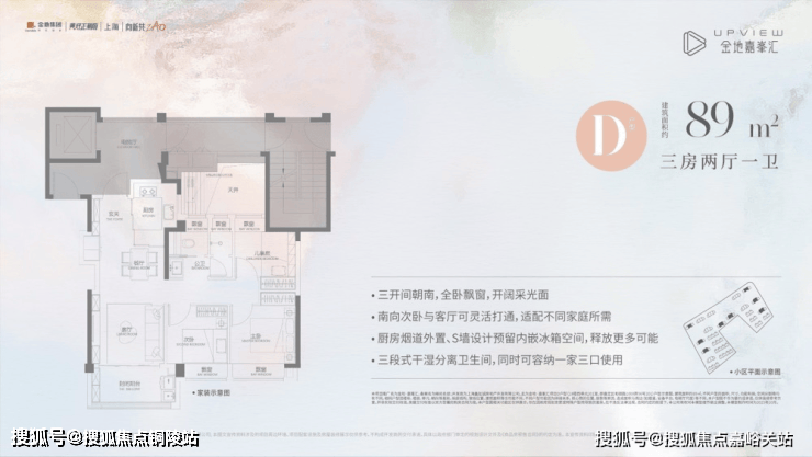 首先,是建面约89㎡三房两厅一卫(D户型),不仅功能完备,而且很好地把控了总价,约350万起即可上车高配品质三房,堪比市场上110平左右的空间感!
