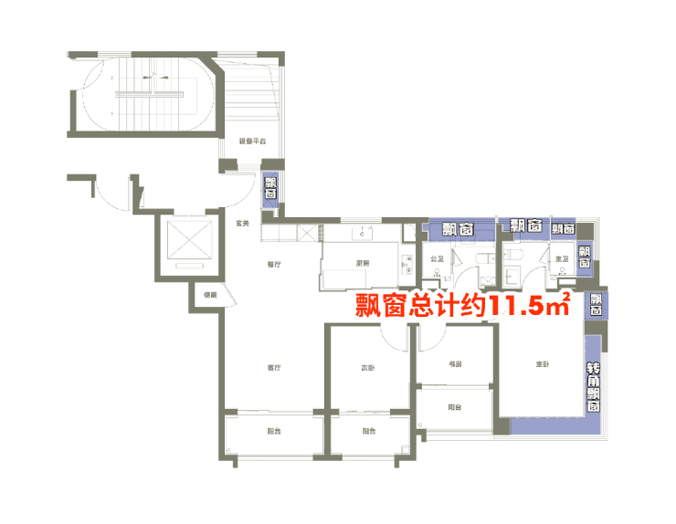同时配备更多飘窗,尤其是主卧 C字型全景飘窗,整体飘窗赠送面积约 11.5㎡,比常规户型多出约2㎡。