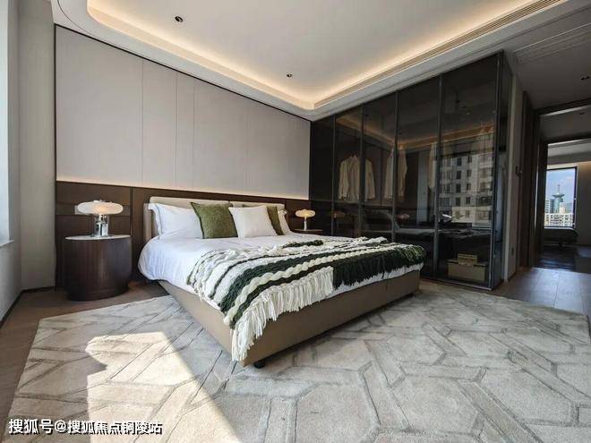 主卧的面宽也足够大,达到了4米,带来非常好的采光面和空间感,可以看到床尾还有非常阔绰的空间。并带有一个套房的功能