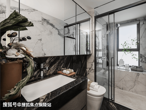 :科勒智能卫浴四件套,主次卫同标,岩板台面 + 防滑大理石地面,质感与实用兼具。