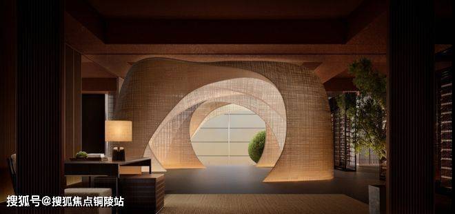 石库门外立面的拱形线条,被复刻到了屏风上;大量红洞石张扬着红色,是致敬风貌石库门屋顶的浪漫色调。