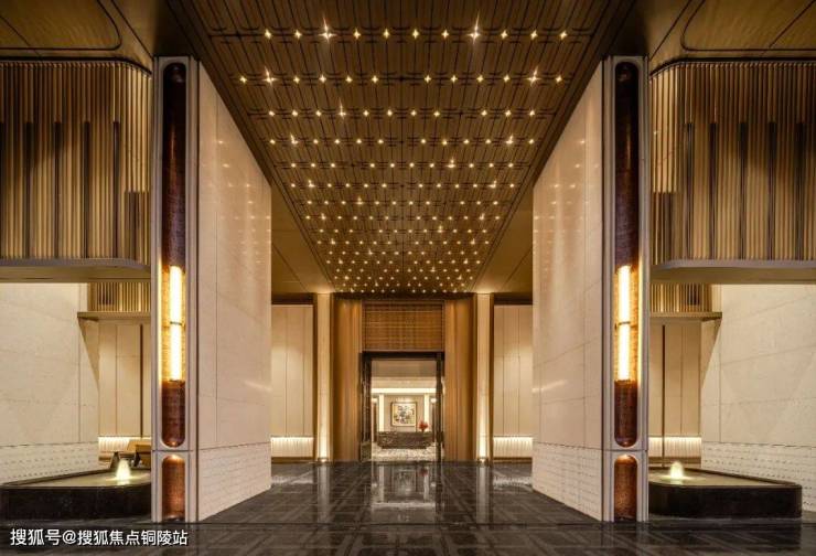 鎏金塔冠,采用曲面拉伸铝网,包裹古铜色铝板,用金属的筋骨雕刻出无数个优雅的弧面,勾勒出静安的天空。
