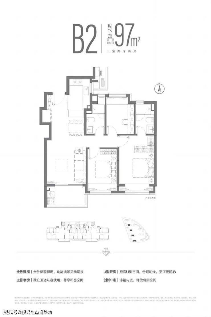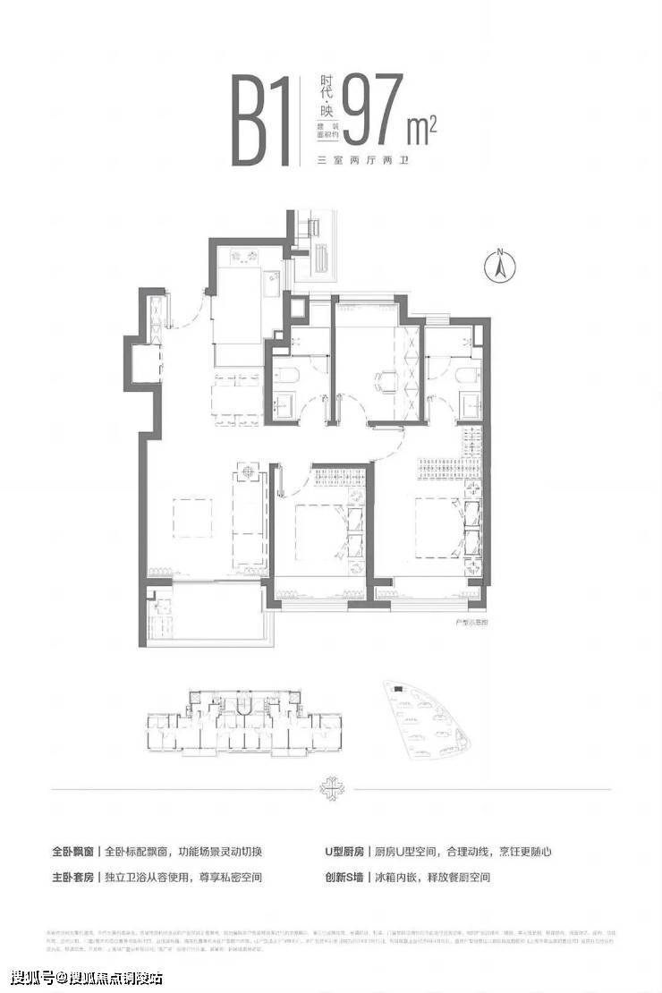 建面约97平的三房两厅两卫,在89户型基础上多了一个卫生间,450-500万级别功能性更强。