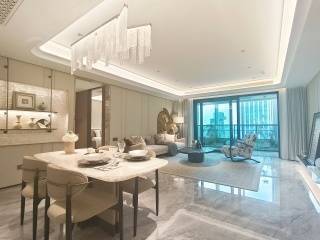 精装标准:采用博世(或同档)厨电、唯宝台盆、高仪智能马桶;玄关石材拼花,电视背景墙奢石+皮革造型;全屋壁纸/木饰面,入户智能锁。
