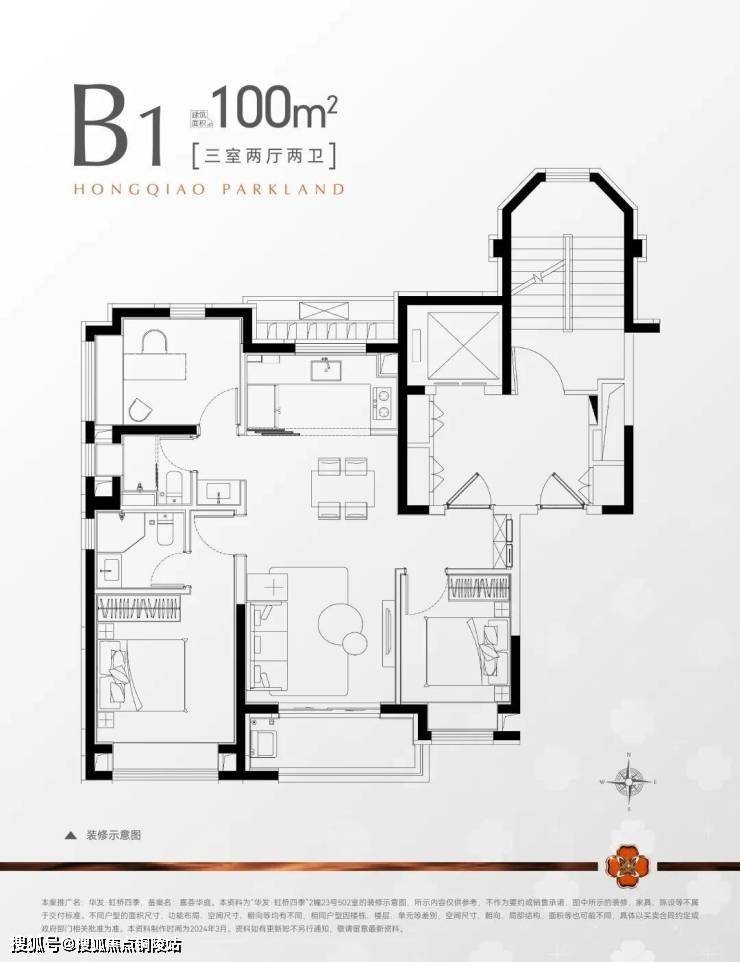 B1户型建面约100㎡,三开间朝南的设计,提高了采光的效率。