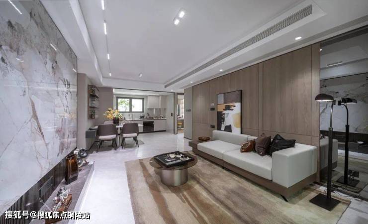 客厅背景墙岩板,客厅采用金属踢脚线,提升整体质感;