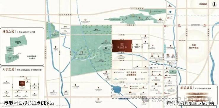 项目西侧一路之隔就是广富林文化遗址、广富林郊野公园、直线距离约1km+是辰山植物园,北面直线距离约3km是佘山国家森林公园、月湖雕塑公园等。